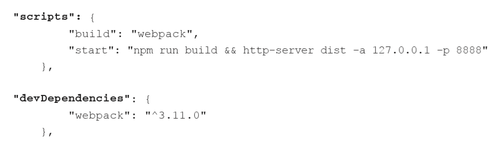 在本例中,我们考虑到用CLI这种方式来运行本地的Webpack不是特别方便,我们将在package.json中添加Webpack的devDependencies和npm script来安装和启动Webpack,同时也指定项目运行脚本命令、构建命令,以及分配测试环境网络端口。