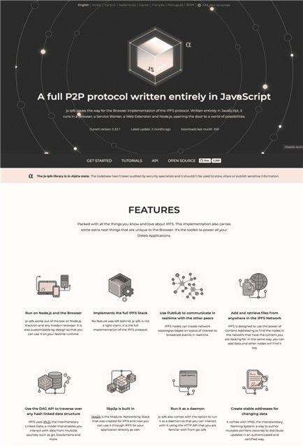 js-ipfs于2018年年中发布,这是一个完全用JavaScript编写、可以运行在Node.js和Web浏览器之上的完整实现,是除了Go语言实现版本之外,蕴含IPFS所有特性和功能最为完整的原生库,如下方图1所示。它为开发者在浏览器及Web应用中集成IPFS协议、启动、运行、操作IPFS节点提供了强有力的支持。