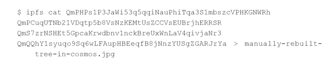 如下所示,我们将QmPH、QmPC、QmS7、QmQQ子块数据通过ipfs cat命令重新组装成了新图像manually-rebuilt-tree-in-cosmos.jpg。