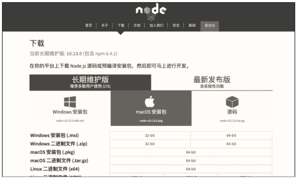 Node.js的下载安装十分简单、快速,灵活,如图8-5所示。我们可以在Node.js的官网下载适合自己操作系统的安装包: