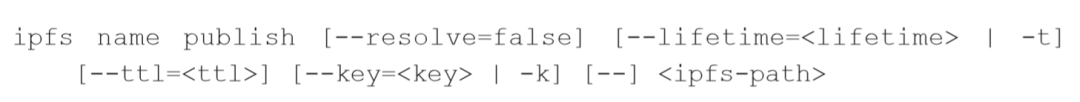 由此可见,节点默认具有一个名为self的Key,它的值正是节点ID。ipfs name publish命令的完整形式如下: