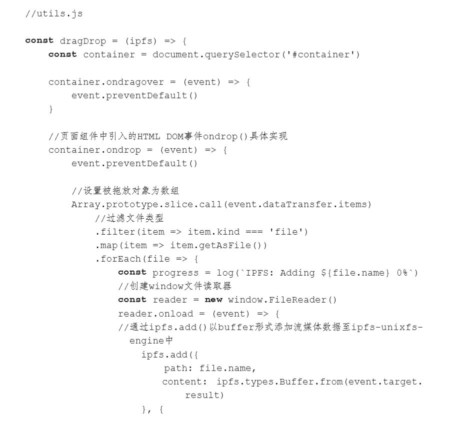 在utils.js中定义箭头函数drapDrop(),职能是处理拖放文件至浏览器之中的响应事件,并将文件添加至IPFS中。