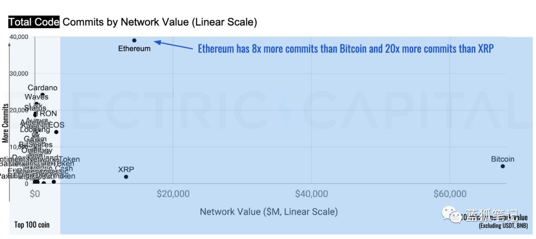 在总代码项目中,以太坊表现最为出色,比比特币多出8倍,比XRP多出20倍。