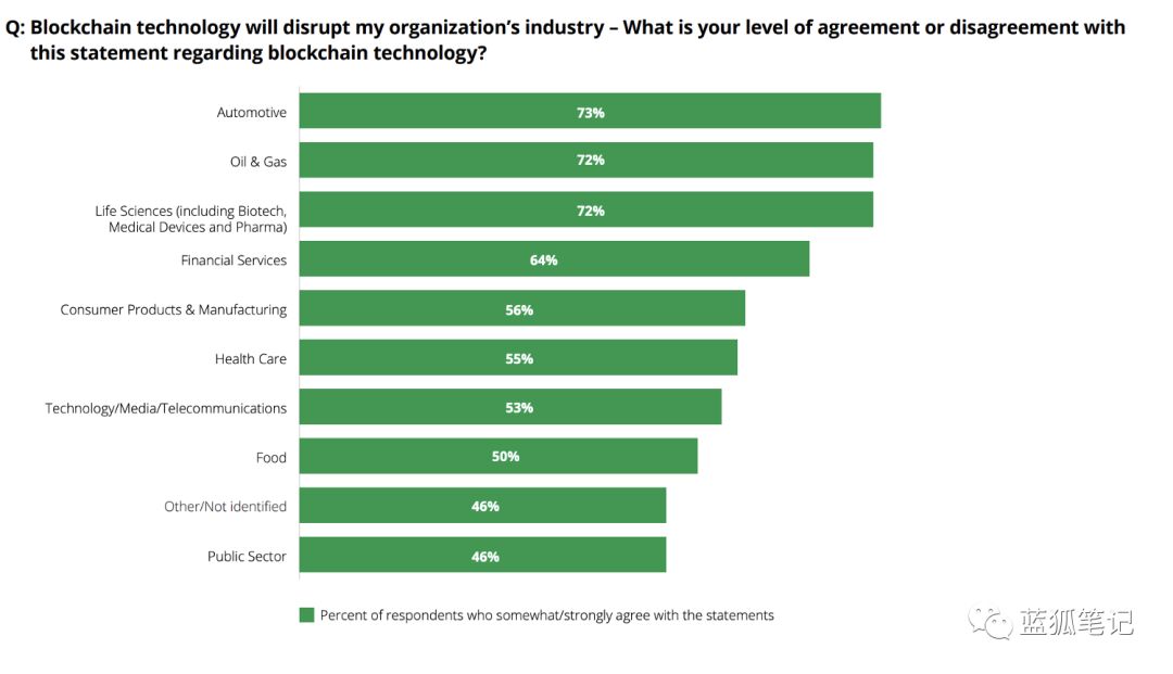 2018年底,德勤(Deloitte)在采访了1,000位看好区块链技术的企业高管后发布了一份报告,总结了它们19年的计划。其中,95%的高管表示,他们的公司计划在2019年投资区块链技术。近40%的高管计划投资至少500万美元。84%的高管认为区块链是具有扩展性的,并将实现大规模主流应用,但也有39%的高管认为该技术目前“被过度炒作”。在德勤的报告中,来自汽车、石油和天然气以及生命科学行业的高管对区块链技术的前景最为看好,紧随其后的是金融服务行业的高管。
