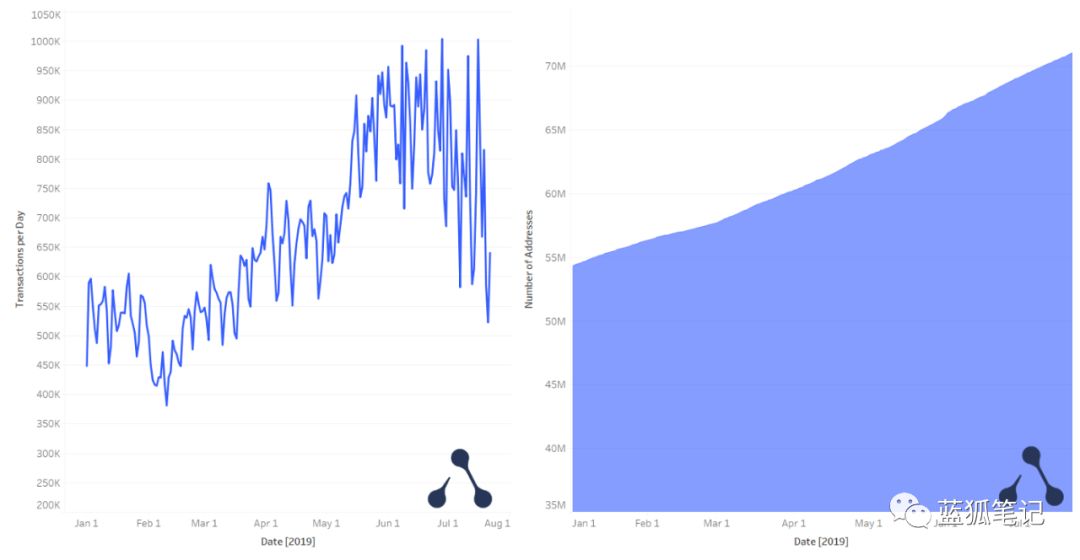 自主网上线以来,以太坊已处理了5亿多笔交易(截至7月17日,为5亿笔交易)。仅在2019年,就已经处理超过1.3亿笔交易,网络利用率仍然相当稳定,平均不到90%。以太坊上存在超过7000万个唯一地址,其中1600万个(16%)是自今年年初以来创建的。