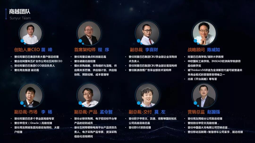 “商越”核心团队大部分来自阿里B2B方向,其中首席业务架构师程序曾任阿里云端点科技副总裁与德勤高级经理,擅长采购战略;副总裁李喜财曾任阿里CBU事业部企业采购技术负责人与阿里CBU事业部交易架构师;战略顾问陈威如为湖畔大学教授,曾任菜鸟的战略顾问;市场副总裁李杨曾任阿里事业部高级专家与甲骨文事业经理。其他成员来自德勤、用友、必联、毕博咨询等企业服务领域的头龙企业。