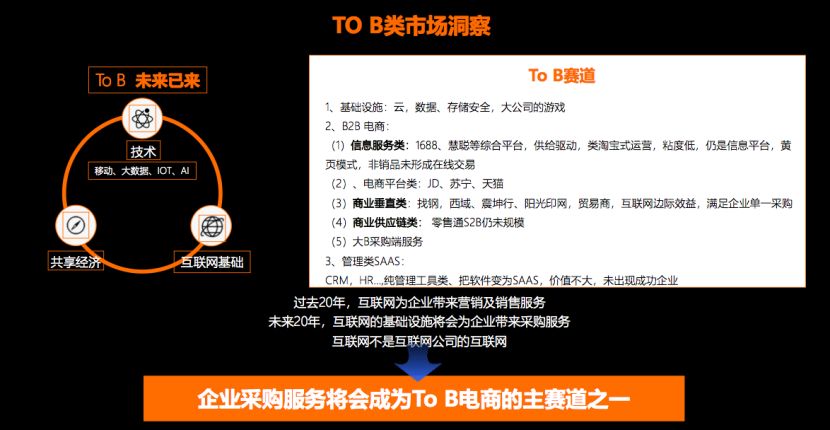 苗峰分析:第一、平台类B2B或信息类B2B是没有前途的,B2B一定要做自营,自建供应链,但具体空间还要看品类;