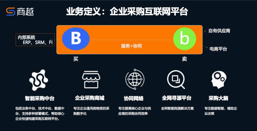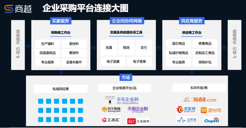 对于供应商来说,互联网采购平台降低了电商平台开拓用户的成本。以往电商平台,每开拓一个B端大客户要花5%的成本,而通过商越的互联网采购平台降低了结对账成本和系统对接成本,将原有成本降至2%以下。