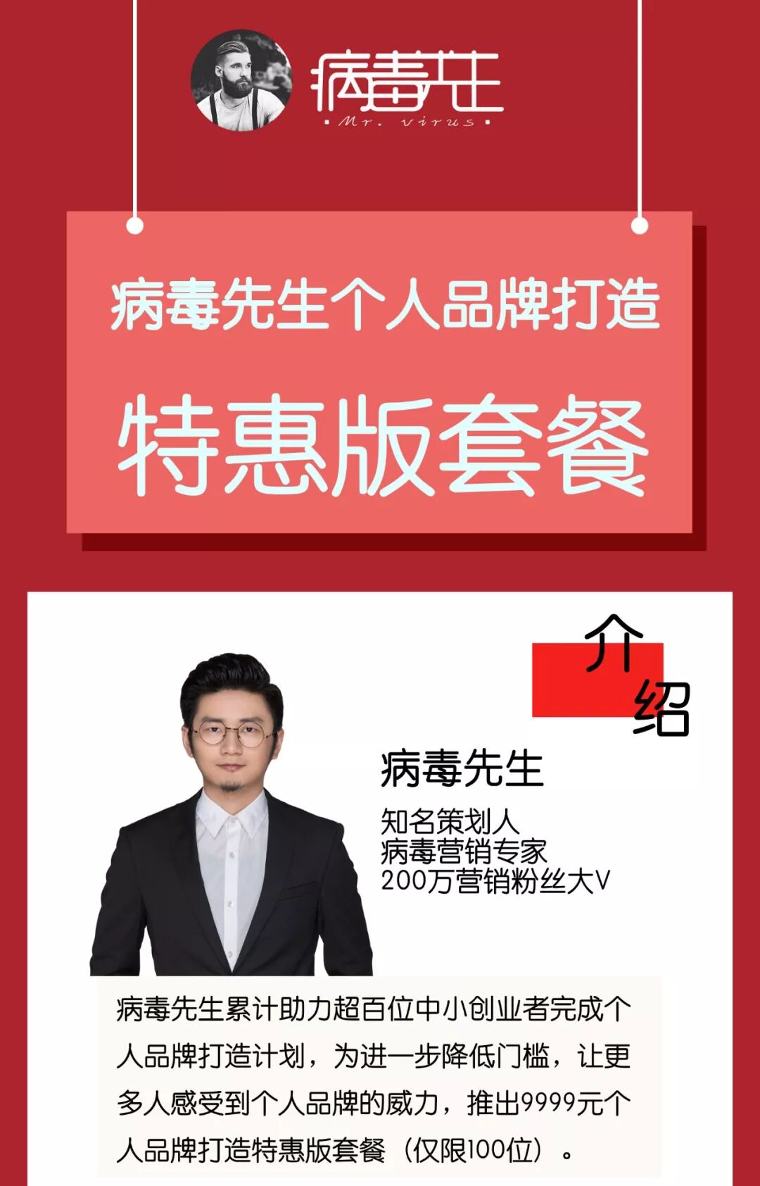 比如某位做B端服务的创业团队客户,近三年每年的平均订单量只有20个,通过一次IP打造的合作,短短一个星期时间内,就获得了50个精准客户的询价,最终确认了15个合作订单,并且源源不断有新的客户通过社交媒体联系他咨询合作,在自己主营业务所在的垂直领域建立IP影响力,对于企业业务量的提升真的是意义非凡。建立垂直领域的个人IP,再通过个人影响力进行业务上的导流变现,这条路已经成为当下创业者一条可选可复制的捷径,但是垂直领域的IP机会会越抢越少,当下可以说是做个人品牌最好的时候,出名要趁早!为了进一步降低参与门槛,让更多中小创业者能够感受到个人品牌的威力,先生把此前的个人品牌打造计划的合作门槛从5万元一次性降低到9999元,重磅推出9999元的个人品牌打造特惠版套餐(这套套餐暂定只接受100位客户),套餐包含十大超值权益,详情如下:1.个人品牌奠基:一篇深度专访+同步到多个媒体渠道传统商务沟通模式是面对面谈合作解决信任问题,名片只是一个辅助,而到了移动互联网时代隔着手机最难解决的就是信任问题,这个时候,如果有一个权威媒体关于企业老板的深度报道直接发给客户,信任难题就迎刃而解。病毒先生团队通过与创业者个人详细接触,为创业者量身打造一套个人专访深度稿,助力企业家树立强势个人IP,建立行业权威。专访内容会发布到一个权威媒体,同时同步覆盖病毒先生旗下自媒体矩阵30个平台(不包含病毒先生公众号)和200+行业群、媒体群,全网直接覆盖200万商业精英人群,迅速建立覆盖全网的超级影响力。(仅此项服务就市场价值5万,2万专访撰稿费+3万全平台发布费)根据创业者个人状况和需求,梳理出一套行之有效的个人品牌操作指南,帮助创业者形成自己独特的风格,从行业领域和公众领域建立鲜明广泛的个人标签符号,助力创业者能够在正确的方向上推进个人品牌的长期运营积淀,帮助中小创业者建立社交媒体上的前期基础框架和内容输出方向,后续只需要根据方向定位源源不断产出内容即可。3.社交媒体影响力:带你涨粉,快速完成从0到1的过渡期社交媒体的影响力打造,最难的就是从0到1的过程,往往需要很长的时间过渡,会通过大号带小号的方式,用我的私域流量和社交媒体影响力去帮助大家更快完成冷启动阶段。所有购买此套餐的朋友,将可以免费获得两次病毒先生朋友圈+社群+今日头条的个人或者企业活动推广机会!凡是购买病毒先生特惠版个人品牌打造套餐的朋友,病毒先生默认成为其所在企业一年的营销顾问,在经营企业过程中遇到的营销难题,都可以在病毒先生这里沟通解决方案,不一定能完全解决大家的经营问题,但是一定会竭尽所能为大家提供帮助。(病毒先生2019年是7家公司的营销顾问,收取的年度顾问费用最低6万起步)百度搜索相关关键词,能够出现相关报道,抢占被动流量的入口所有购买此套餐的朋友,都可以免费进入病毒先生核心商业交流群,群里都是营销、科技、商业、媒体等领域的顶级大咖,一步到位接触中国最顶尖的商业圈。同时,等第一期100位成员全部招募完成后,会拉大家进入第一期成员专属社群,在这个群里我会持续分享个人品牌打造的道和术,也会及时给大家同步新发现的红利机会,告诉大家如何快速跟进执行。一切的动机最终都要归到钱上,在带着会员们打造个人品牌的路上,根据每位朋友的自身情况,会给朋友们一对一规划多条商业变现的路径,帮助大家打造一个能够源源不断挣钱的机器,只要够勤奋,赚回套餐费用是很轻松的事情。病毒先生会从100位个人品牌打造的朋友中,挑选出优质的作为典型案例,在病毒先生的全网自媒体渠道和线上线下培训课程中分发,进一步扩大朋友们的个人影响力。所有购买了病毒先生特惠版个人品牌打造套餐的朋友,都优先享有病毒先生的客户和渠道推荐权益,对于优质的对口的客户和渠道,会优先推荐给大家。到了这里,如果大家还不清楚病毒先生个人品牌打造计划是做什么,再通俗一点说,对于一个在互联网上没有任何声音的创业者,通过这一套会员的服务,已经初步具备别人觉得你很牛逼的实力,并且有一张明确的个人品牌打造的执行表,知道自己未来应该在个人品牌打造上做哪些事情。