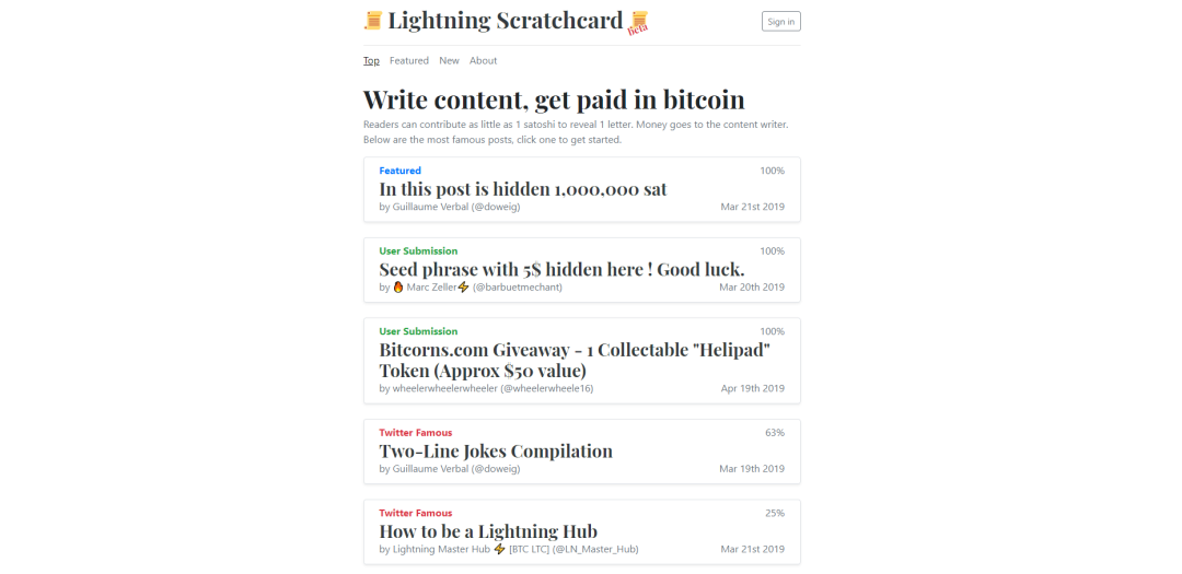 一个名叫闪电网络刮刮乐( Lightning scratchcards )的付费内容阅读平台,其中的帖子就像刮刮乐一样,用户需要付费来刮开每个字母查看内容: