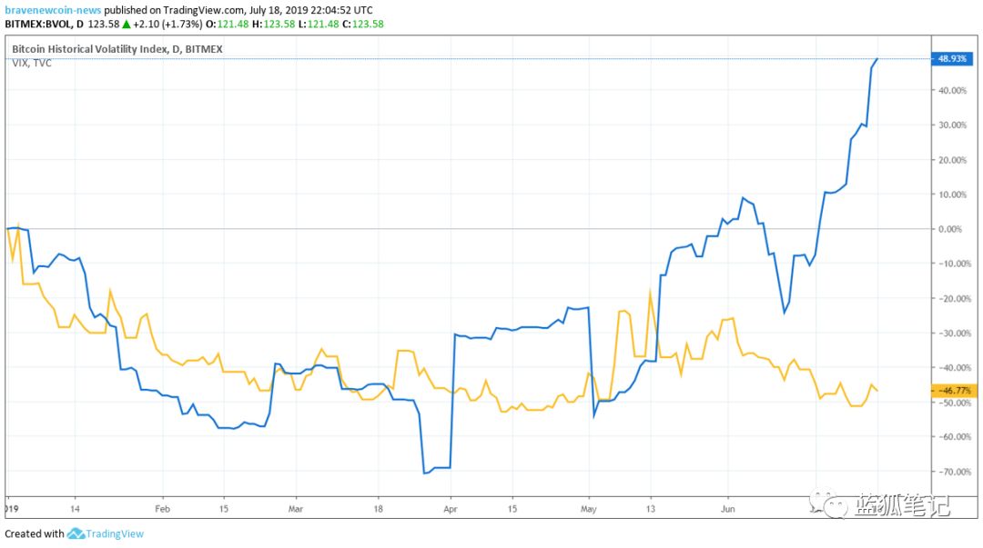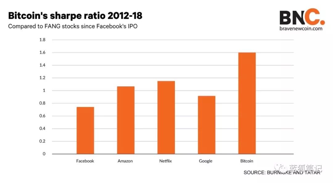 Sharpe Ratio是投资密切关注的指标,用于衡量资产的风险回报率,根据该指标,比特币从2012年以来的表现优于FANG股票(蓝狐笔记注:FANG指Facebook、Amazon、Netflix、Google等科技巨头),跟Facebook相比,这些年来波动性起伏,比特币已经产生高两倍的风险回报。