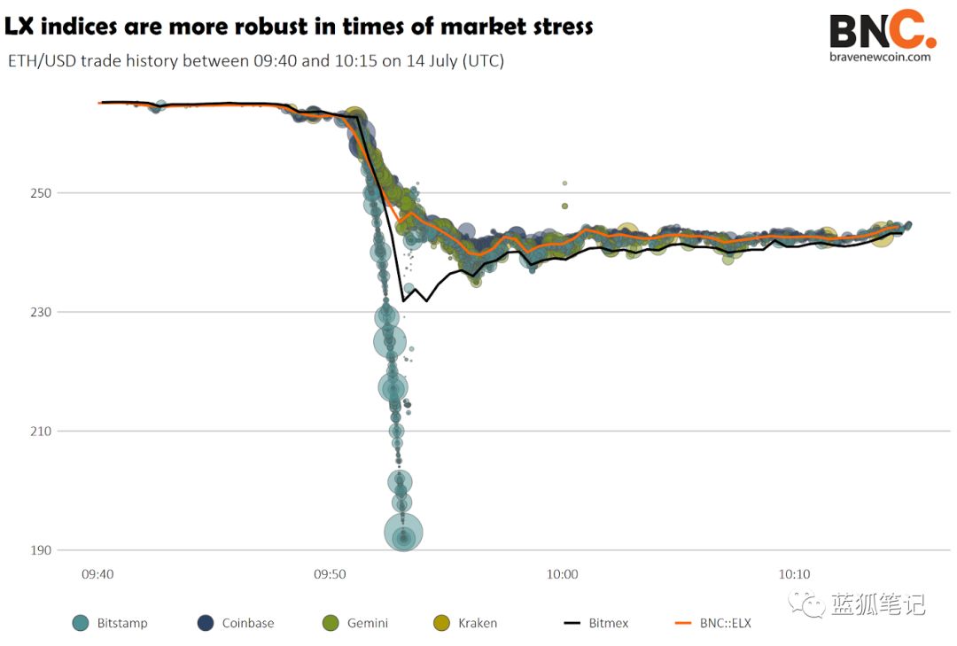 当Bitstamp有抛售ETH的大量卖单时,使用BNC的以太坊流动指数价格(ELX)可以保护交易员止损,尤其是在Bitmex和Bitstamp上。LX系列指数通过计算比特币、Ripple和以太坊的“公平全球价格”,将全球六大最具流动性的交易所的交易量和价格加在一起,按订单深度加权。它还能量化和过滤虚假交易量。