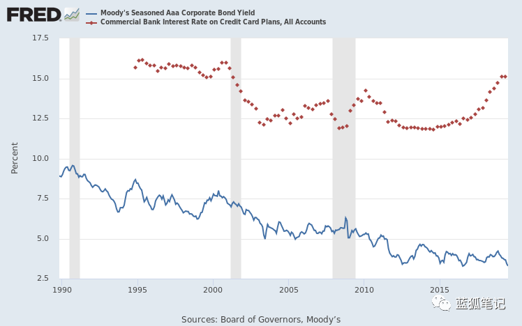 由于借贷利率如此之低,公司债务(在美国股票回购中发挥很大作用)达到历史高位水平。与此同时,信用卡消费贷款也几乎创下历史新高,在企业利率持续下降的同时稳步上升。