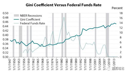 低利率带来的美国财富转移,可以从不断扩大的贫富差距中反映出来。基尼指数(The Gini Index),被用来衡量一个国家的不平等程度,自20世纪80年代以来,它与美联储基金利率呈高度负相关。也就是说,当利率下降时,它会提高富人拥有资产的价格,并扩大贫富差距。