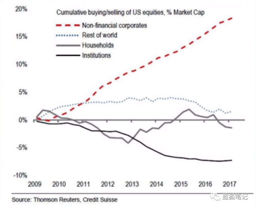 正如在零利率时代,央行是政府债的最大持有者一样,美国公司也成为了股市中最大的股票持有者(主要是他们自己的股票)。