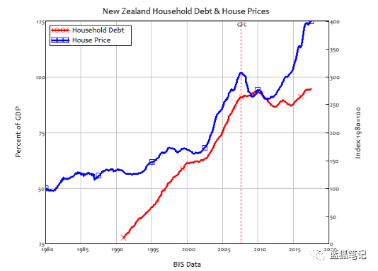 新西兰房价与家庭债务的相关性为0.82(高度相关),来源:Steve Keen教授