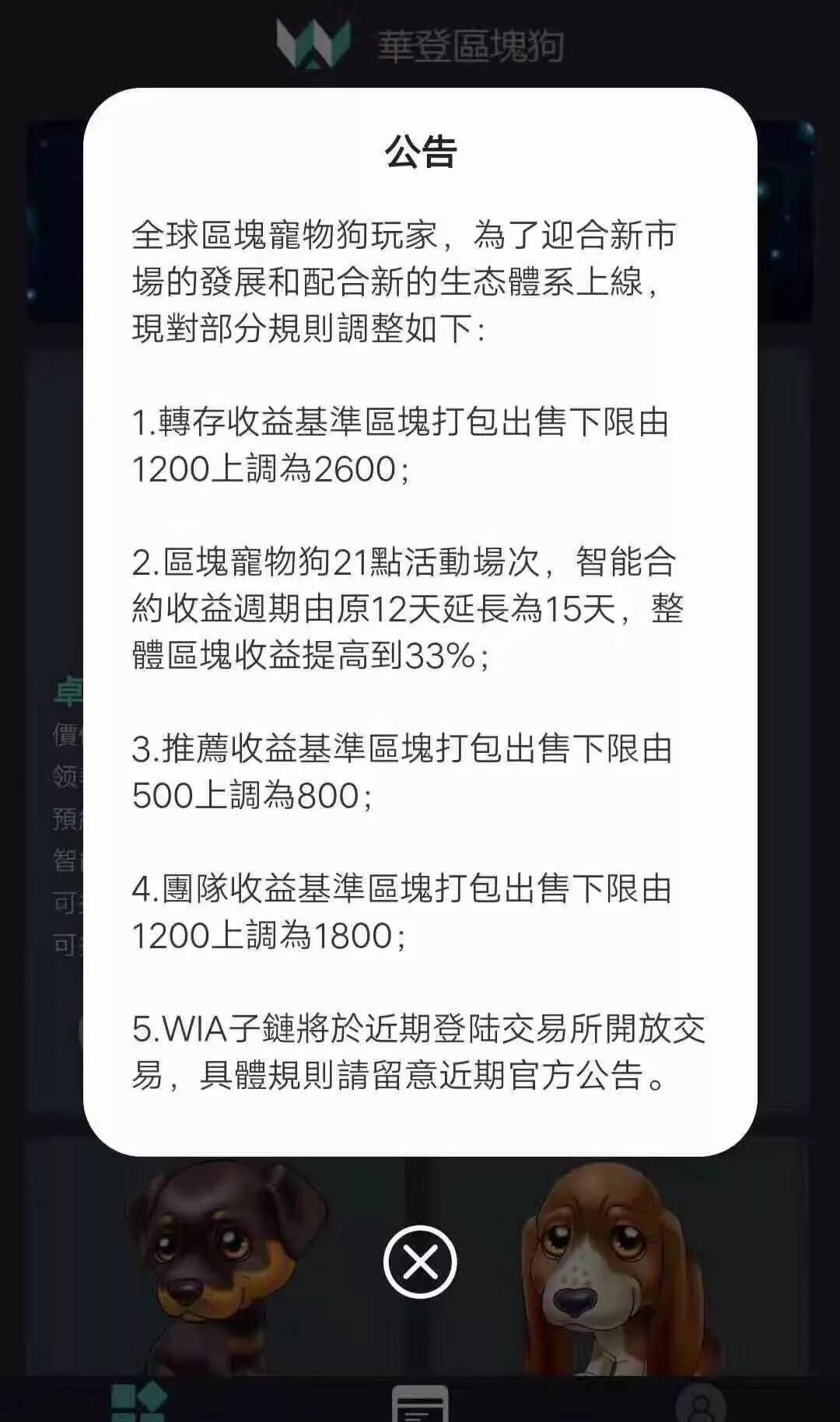 或许是“杨超越”起了作用,灵儿在8月10日打开APP,欣喜地发现了团队的新公告。新公告表示将按照计划于16日开放区块狗领养,但将作出以下调整:将关闭点对点交易,兑现渠道仅允许区块链资产,WIAC将开放兑换,受该公告的利好影响,WIAC也大涨至7元有余。