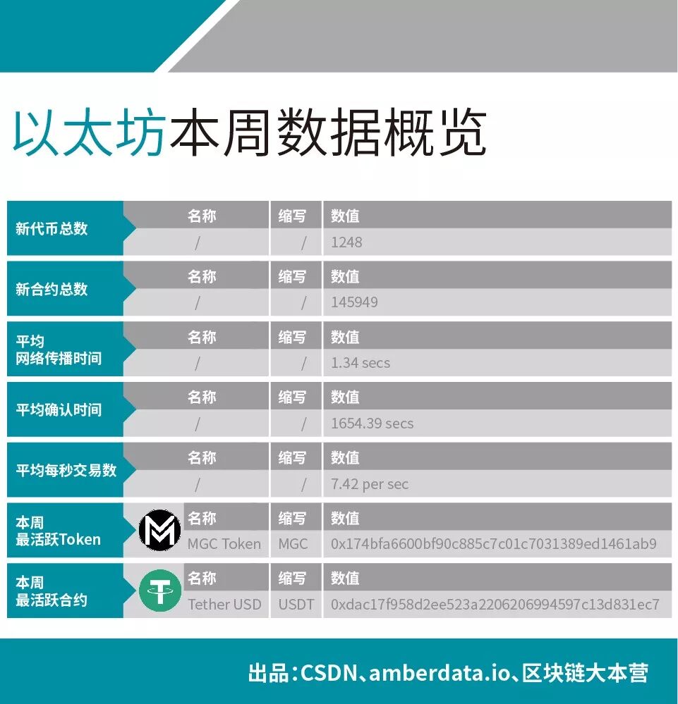 这本周,以太坊新代币生成的总数有1248个,产生的新合约有145,949个;MGC和Tether分别为本周最活跃的Token和智能合约。