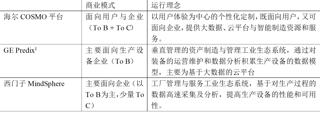 综上所述,海尔COSMO平台的运行机制的核心理念在于以用户为中心,保证用户在生产全流程、全周期参与的体验迭代,通过与用户持续交互实现用户终身价值。这也是海尔COSMO平台区别于国外主要工业互联网平台的关键所在(见表1)。