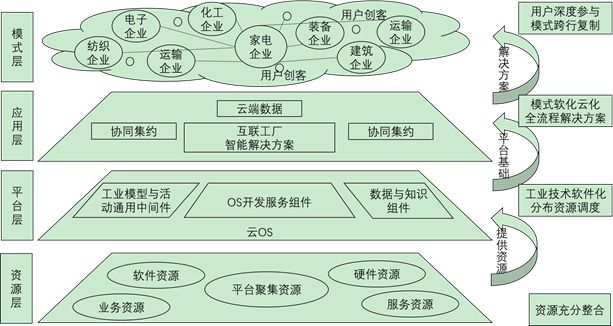 1)海尔COSMO平台的业务架构。海尔COSMO平台的目标为打造开放的工业级平台操作系统,在此基础上聚合各类资源,为工业企业提供丰富的智能制造应用服务。目前,COSMO平台的业务架构主要为四层,自上往下依次为:业务模式层、应用层、平台层和资源层(见图1)。