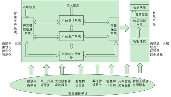 2)海尔COSMO平台的运行机制。海尔COSMO平台目前的运行机制为在智能服务平台上建设智能生产系统并构建智能产品、智能设备与用户的互联互通(见图2)。