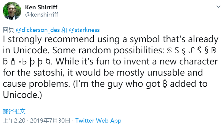 Ken Shirriff强烈建议社区选择现有的符号。他说:“虽然为聪创造一个新字符很有趣,但基本上是不可用的,会产生问题。”他在推特上给出了一些例子。