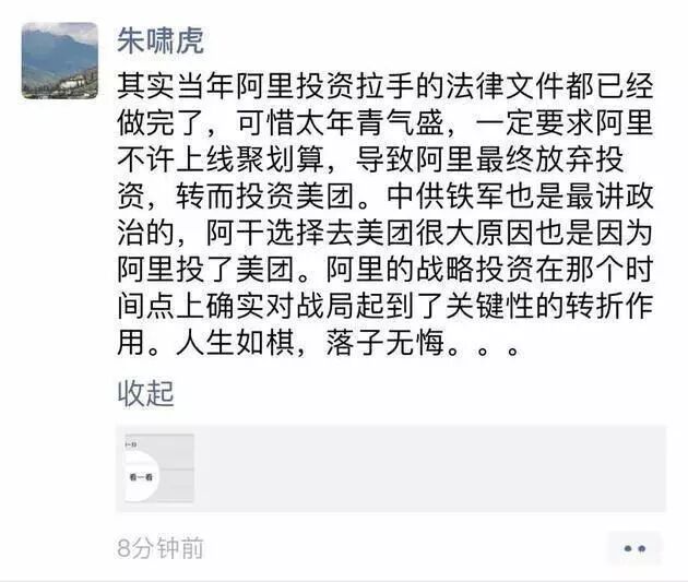今年4月,金沙江朱啸虎在其朋友圈发文称,当年(阿里)投资(拉手网)的法律文件都已经做完了,“可惜(拉手网)太年轻气盛,一定要求阿里不许上线聚划算,导致阿里最终放弃投资,转而投资美团。”朱啸虎说,阿里的战略投资在那个时间点上确实对战局起到了关键性的转折作用。