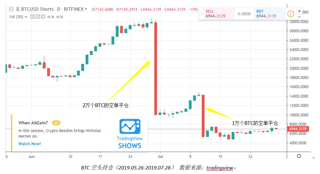 6月30日,空头持仓瞬间平仓超过2万枚比特币,7月11日,空头再次平掉近1万枚比特币的空单。这一番突发操作,令很多人质疑Bitfinex的多空持仓数据是否真实,在数字货币交易所深度明显欠缺的情况下,如此大额的仓位能快速平掉,不得不令人产生怀疑。