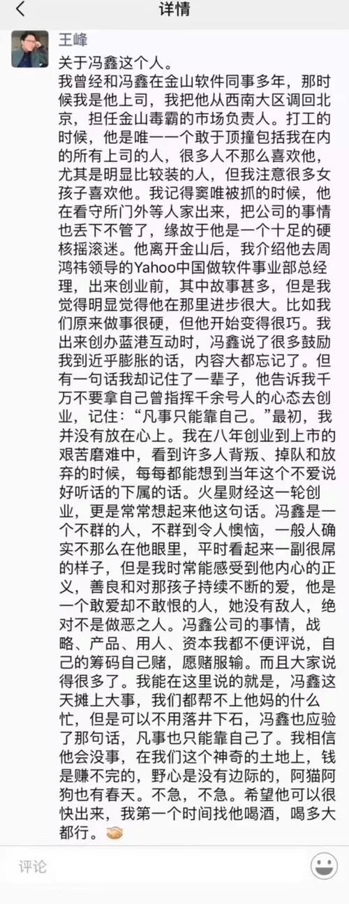 他在金山时期的老上司、蓝港互动创始人王峰在朋友圈发长文谈自己眼中的冯鑫,直言他没有敌人,绝对不是作恶之人。并呼吁众人,“不能帮上什么忙,但也别落井下石。”