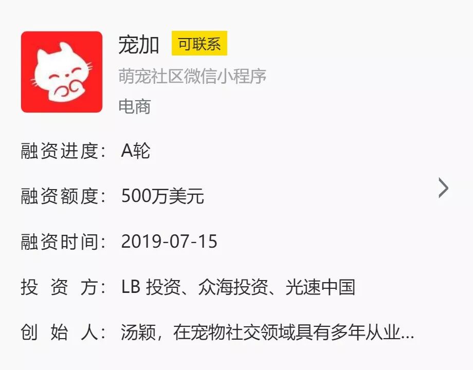 这种模式也在资本上获得认可。半年内,宠加已完成两轮融资,分别为2019年2月险峰长青、光速中国的千万级人民币天使轮与2019年7月LB投资、众海投资、光速中国的500万美元A轮。