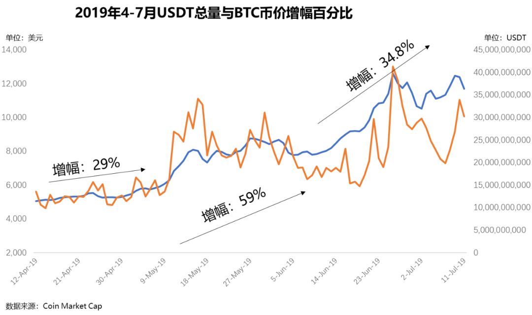 3. 7月2日、4日Tether增发2亿枚USDT,比特币价格由10000美元以下直接跳跃至12000美元,涨幅达到23%