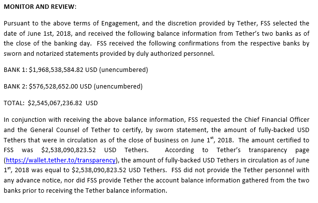 2018年6月律师事务所Freeh, Sporkin & Sullivan LLP (FSS)受Tether委托出具其USD账户余额的报告,但该报告并不是由审计机构出具。至此之后,我们未见Tether披露的其他第三方机构调查报告。