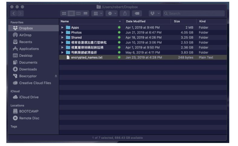 现在不需要加密就能存储照片、视频就更方便了,而且被复制、丢失、被盗的数据的成本也很低。通常情况下,只有在数据已经在网上公开共享的情况下,才会保留未加密的数据。上面带有模糊名称的文件夹是使用Boxcryptor加密的,下面将很快介绍。