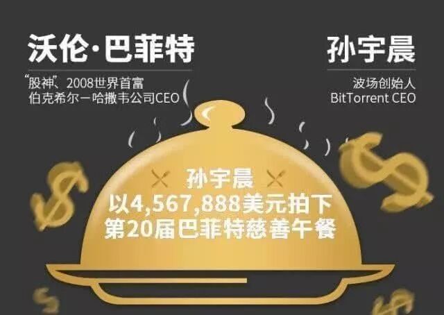 自从孙宇晨出现在公众视野,闹剧便一场接一场地出现了。4567888美元拍下的巴菲特午餐,则将故事推向高潮。