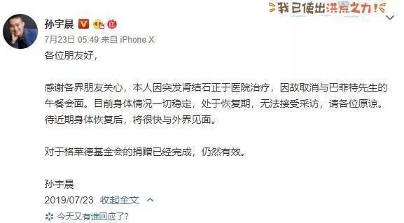 7月23日,在距离“巴菲特午餐”兑现仅剩两天时,孙宇晨突然在微博宣布,“本人因突发肾结石正于医院治疗,因故取消与巴菲特先生的午餐会面。”