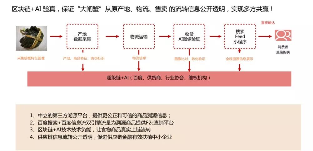 以百度超级链大闸蟹溯源为例,厂商在蟹农捕捞大闸蟹之后,对大闸蟹产地、照片和蟹商认证蟹号进行采集,将信息透明、安全地储存在区块链上,消费者在收货时可以利用AI蟹脸识别技术将大闸蟹信息与链上记录的信息进行对比,确保每一只品牌大闸蟹和产地等信息的前后一致性。