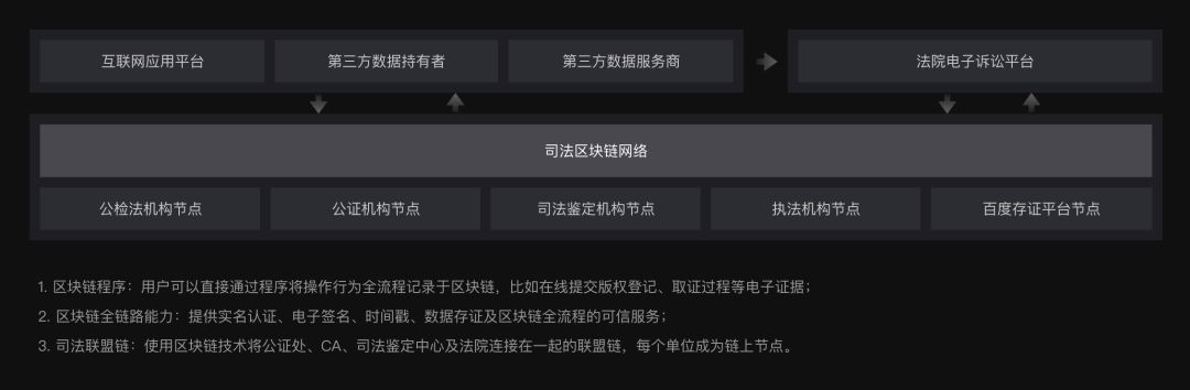 在司法存证项目中,超级链作为底层技术为北京、广州互联网法院搭建了司法存证链,实现了区块链电子证据具备司法效力;