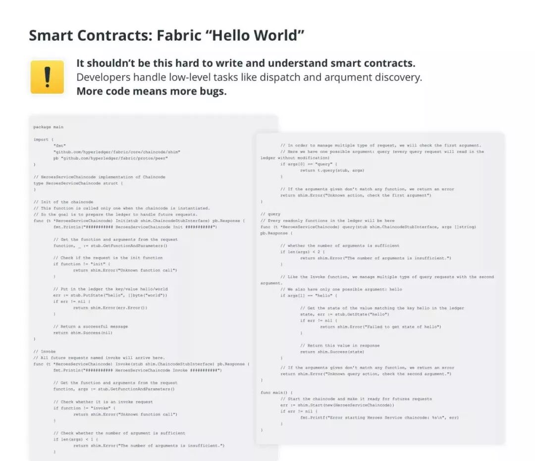 Chaincode 在这几个方面可谓是彻彻底底地失败了,我们发现被誉为开发人员的第一个程序 “Hello World” 在其他语言中仅需几行就可以实现,而在 Chaincode 中居然需要150行之多。代码越多,可能存在的漏洞就越多。这么大数量的代码中可能隐藏着很多能造成数百万美元损失的漏洞。