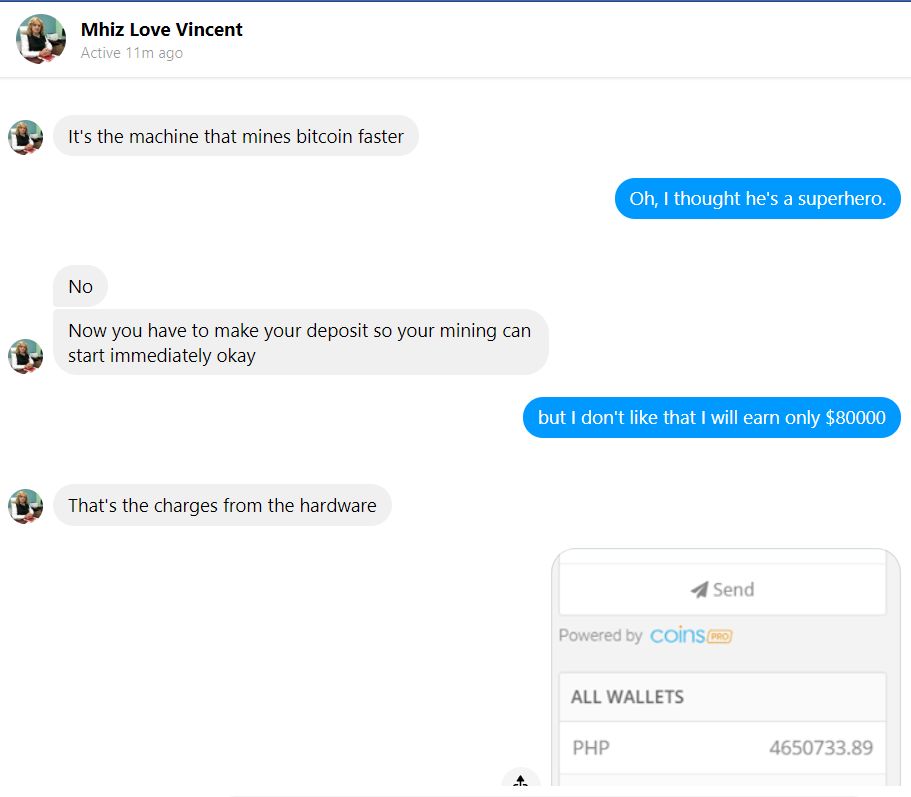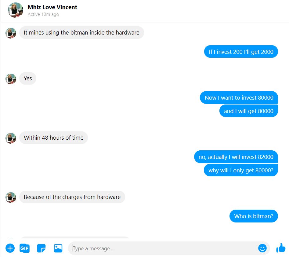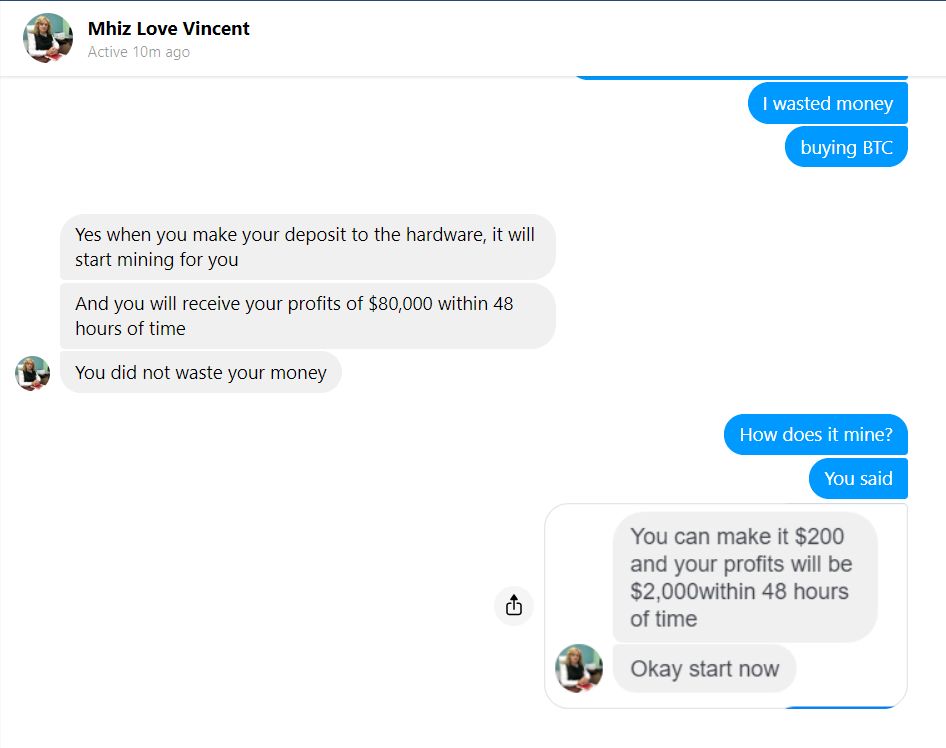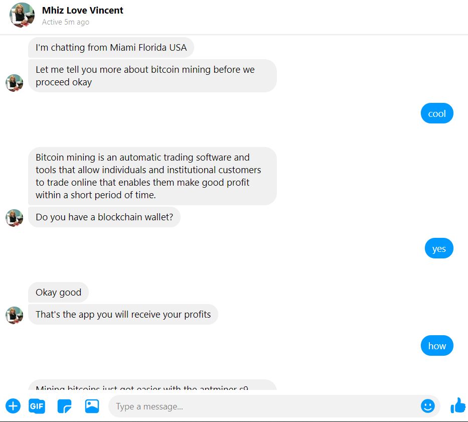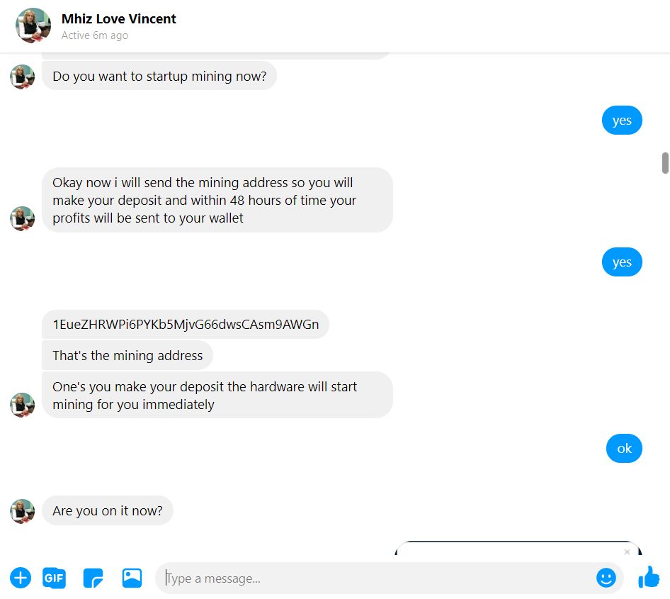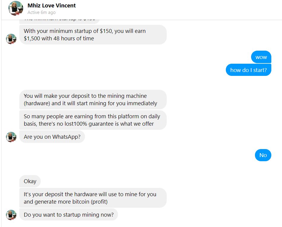 前段时间,「BCD4」在 Messenger 上收到了来自一个名为 Mhiz Love Vincent 的陌生人的消息,“hi,你对比特币挖矿感兴趣吗?不需要经验,收益丰厚哟!”