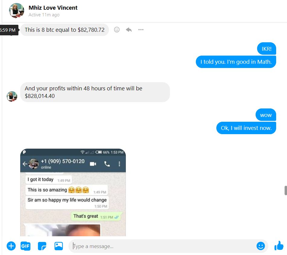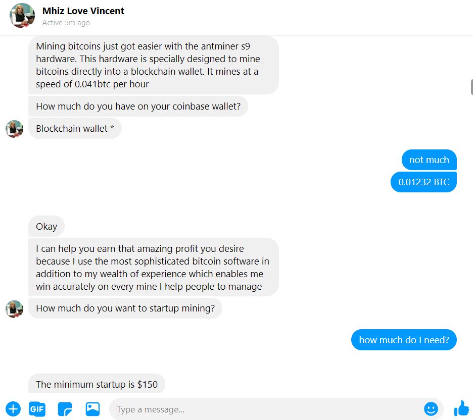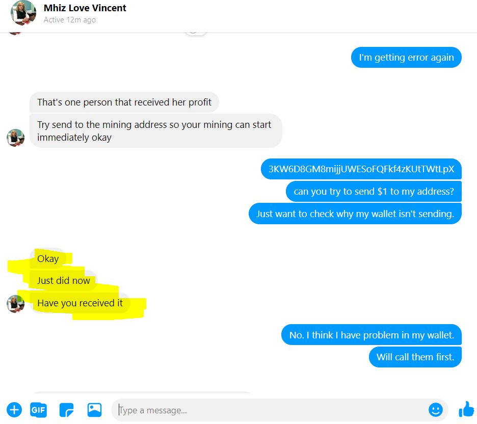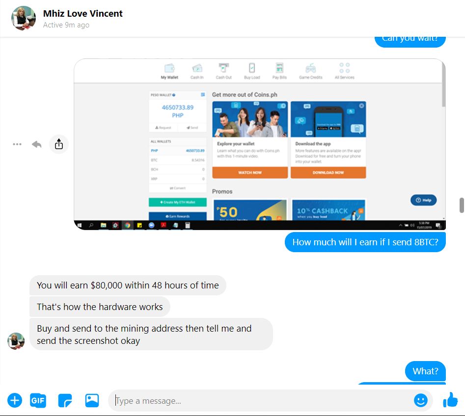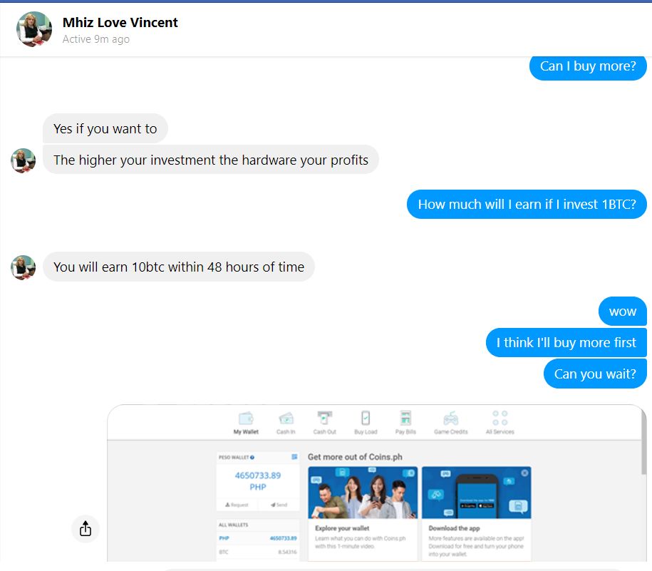 前段时间,「BCD4」在 Messenger 上收到了来自一个名为 Mhiz Love Vincent 的陌生人的消息,“hi,你对比特币挖矿感兴趣吗?不需要经验,收益丰厚哟!”