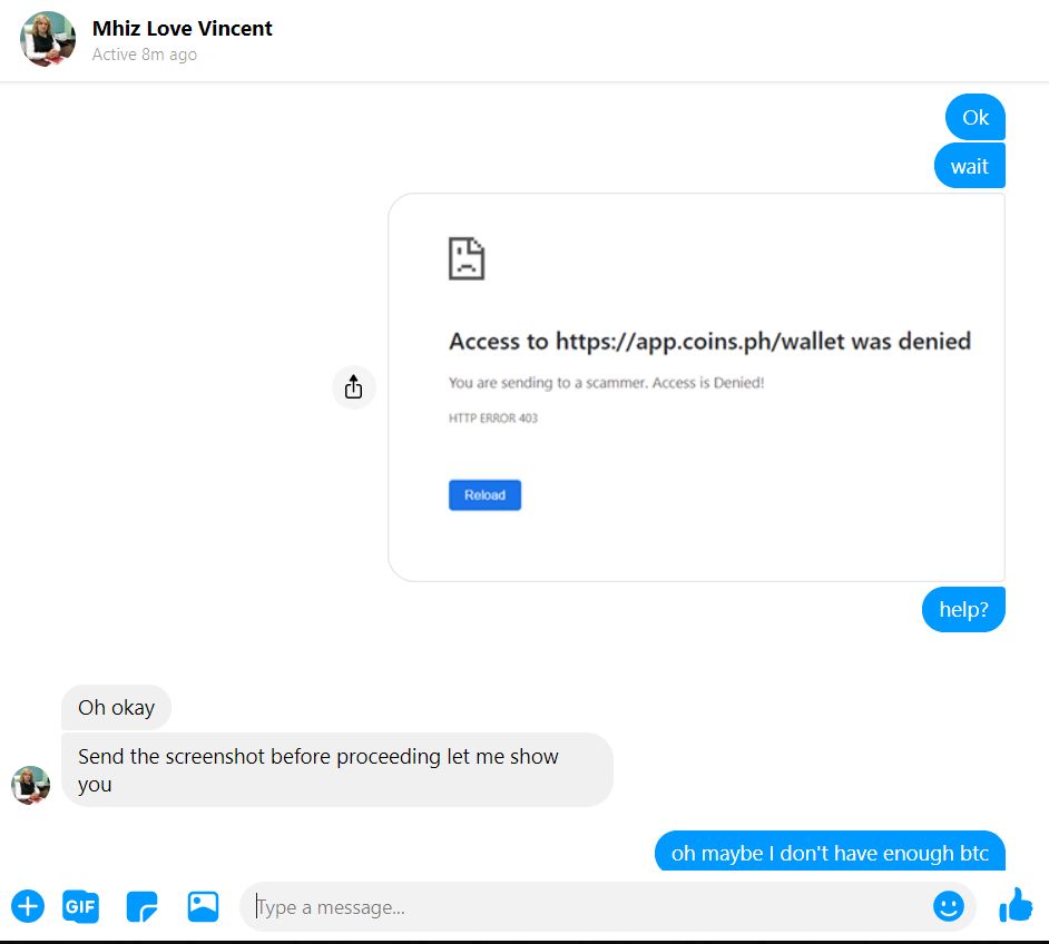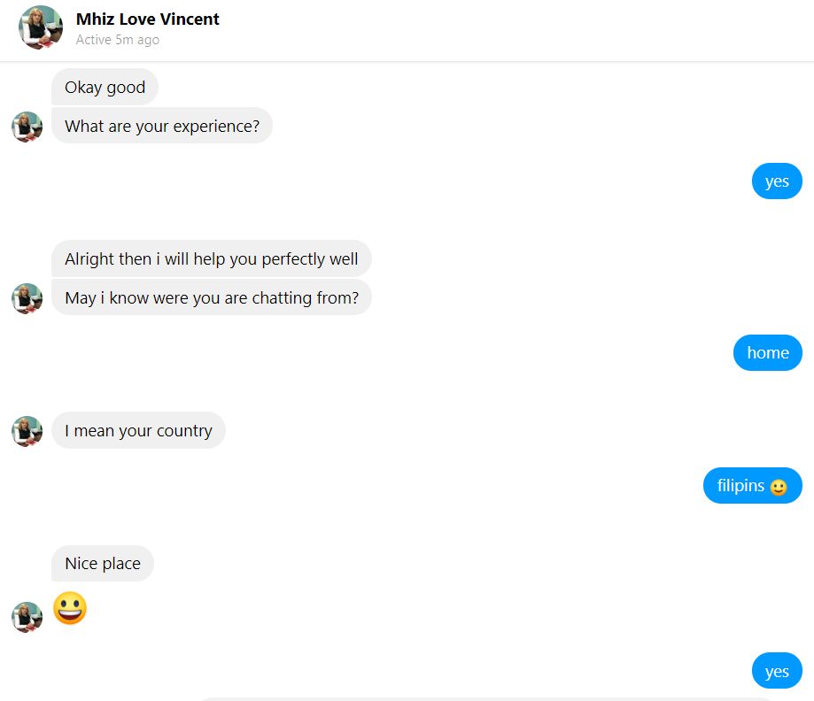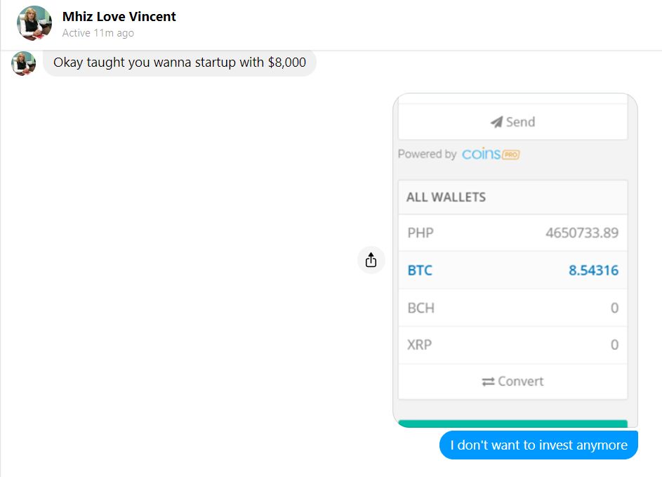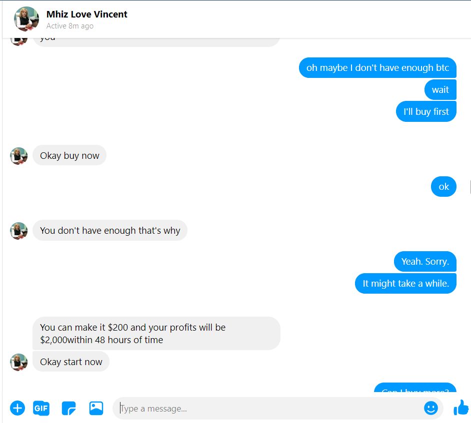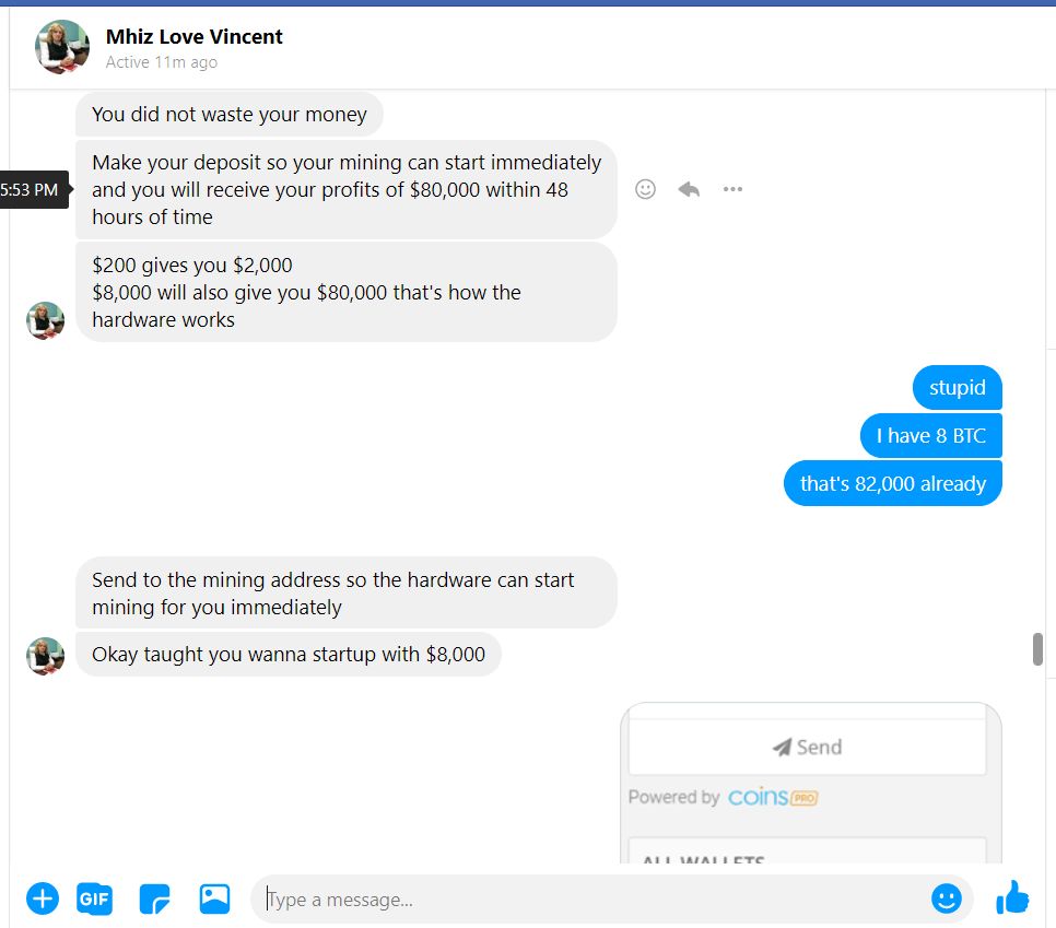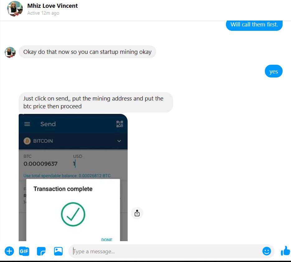 前段时间,「BCD4」在 Messenger 上收到了来自一个名为 Mhiz Love Vincent 的陌生人的消息,“hi,你对比特币挖矿感兴趣吗?不需要经验,收益丰厚哟!”