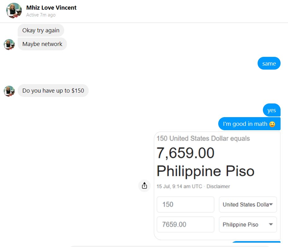 骗子急了,“再试试,是不是网络不好...”、“你的钱够150美元吗?”、“可以少一点,试试80美元?”