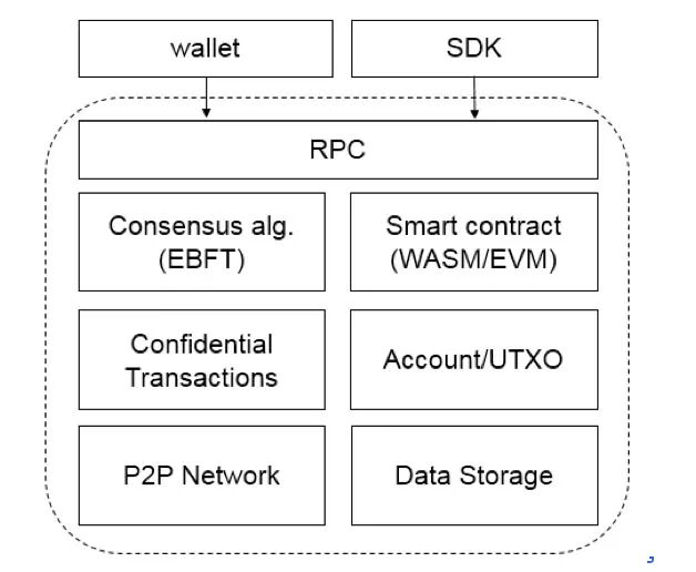 可以看得出来,这个技术架构是与其目标定位相关的,例如EBFT实现高性能目标,Confidential Transactions实现隐私保护目标,Account/UTXO实现多资产管理的目标。