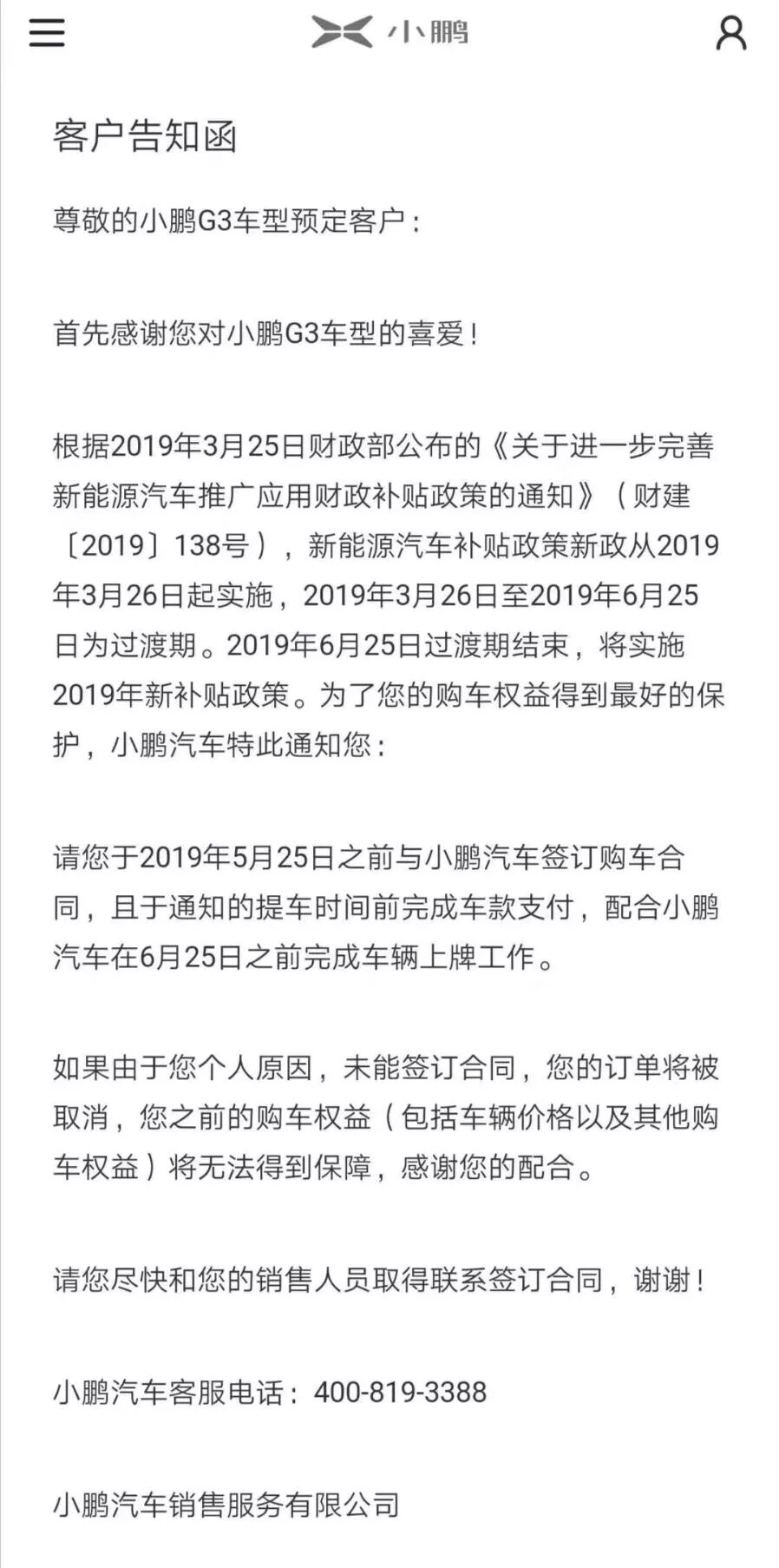告知函还称,小鹏汽车通知车主于2019年5月25日之前与小鹏汽车签订购车合同,且于通知的提车时间前完成车款支付,配合小鹏汽车在6月25日之前完成车辆上牌工作。如果由于车主个人原因,未能签订合同,订单将被取消。