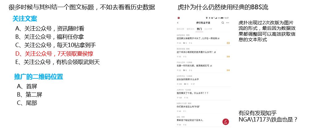 A/B TEST的原则是控制变量,小范围测试快速产出效果,强调快速试错。我们发现虎扑APP一直使用经典的BBS流而不是目前比较流行的图文feed流,很大程度就是快速测试和试错的结果。