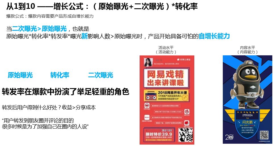 爆款内容需要产品形成自增长能力,自增长能力的核心是“转发率”。“转发率”可通过活动或内容策划来获得,但核心要解决的问题点只有一个:“转发后用户得到什么好处?”用户转发的收益要大于这次转发的分享成本。