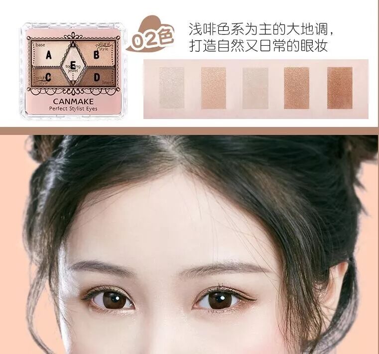 这盘眼影显色度高,要轻轻蘸取,抖抖粉再上眼晕开,两个颜色可以单用,也可以叠涂(使用蜜桃色打底,再在睫毛根部小范围晕开深色)是一盘春夏秋冬都能用到的日常盘~如果你觉得眼球中央欠一点珠光色,可以用上一盘canmake中间的亮片色来搭配呀~