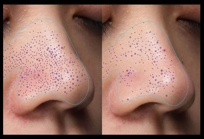 紫色点为皮肤黑头记号,紫色点越少黑头越少10