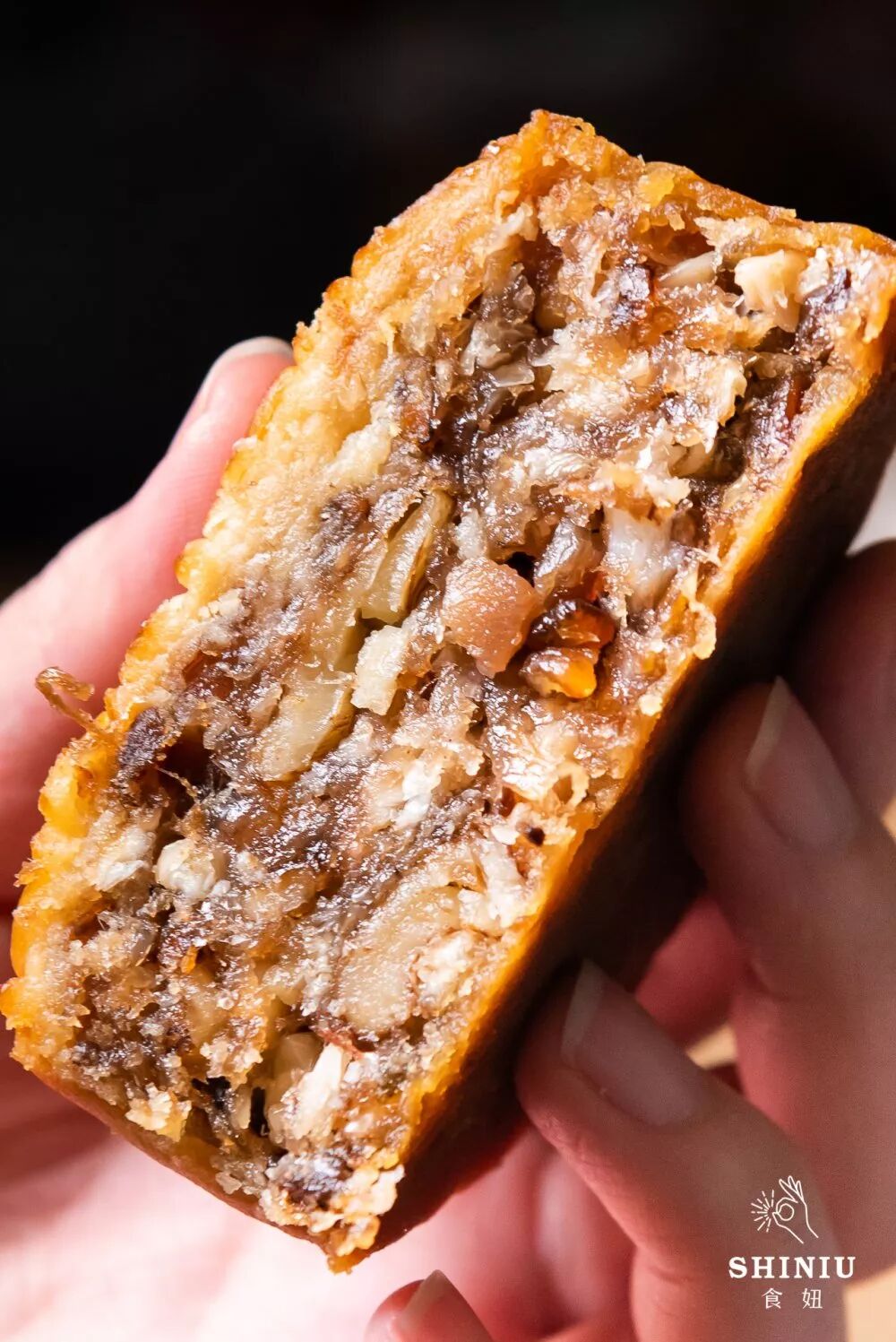 打开包装,油香和蚝香味扑鼻而来。一刀切下去,映入眼帘的是各种果仁,还泛着油光,实在是引人犯罪呐。