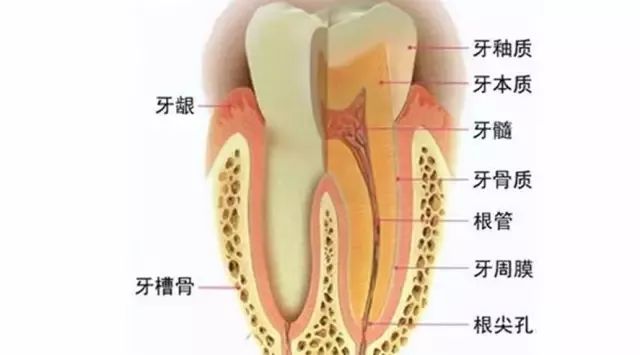 单从牙齿的外观上看,白白的一小颗感觉挺简单,但实际上牙齿的构造可比我们想象的要复杂的多,来看看下面这张牙齿剖面图~